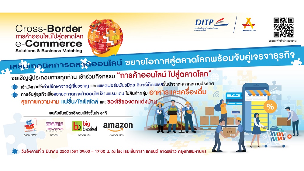 กรมส่งเสริมการค้าระหว่างประเทศ (DITP) กระทรวงพาณิชย์จับมือพันธมิตรออนไลน์ชั้นนำ ได้แก่ Kha-leang (ตลาด CLMV), Tmall Global Partner (ตลาดจีน), BigBasket (ตลาดอินเดีย) และ Amazon (ตลาดอเมริกา) จัดกิจกรรม “Cross-Border e-Commerce Solutions & Business Matching” ณ กรุงเทพฯ เพื่อต่อยอดการส่งเสริมผู้ประกอบการให้สามารถขายสินค้าสู่ตลาดต่างประเทศ ผ่านร้าน TOPTHAI บนแพลตฟอร์มอีคอมเมิร์ซ